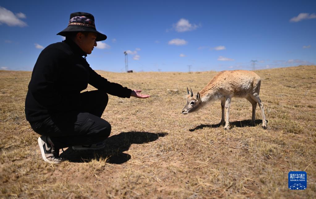 在可可西里國家級自然保護區索南達杰保護站,巡山隊員扎西桑周在野生動物救助中心內與一只被救助的小藏羚羊互動(5月30日攝)。