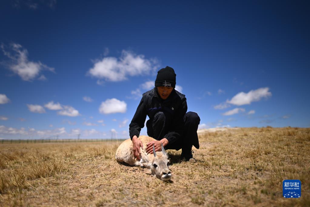 在可可西里國家級自然保護區索南達杰保護站,巡山隊員才文多杰在野生動物救助中心查看被救助的藏羚羊身體狀況(5月30日攝)。