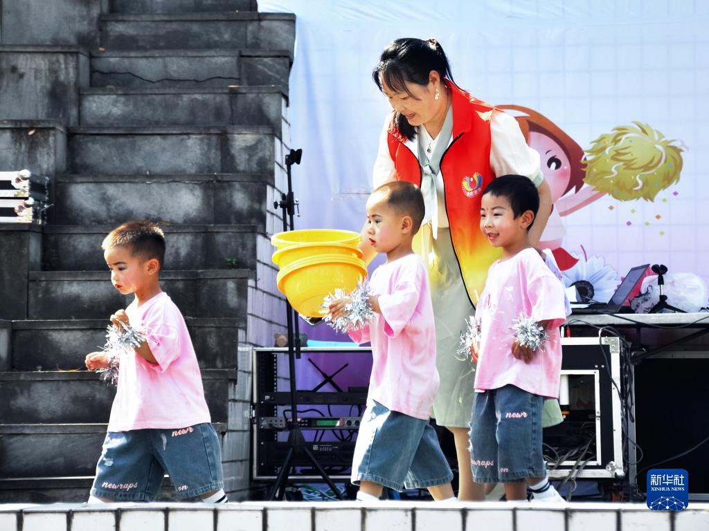 5月30日,在四川巴中市南江縣集州街道楊家河社區舉辦的慶“六一”文藝演出活動中,“童伴媽媽”吳莉陪伴著孩子們上臺表演節目。