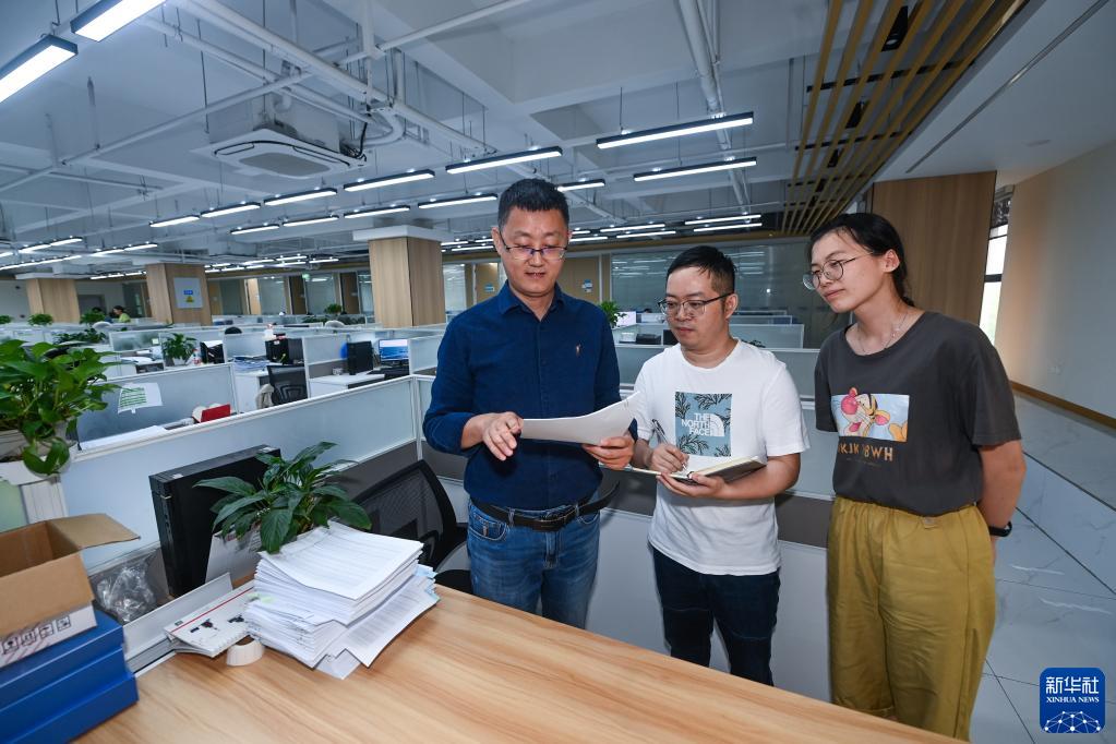 5月31日,在位于嘉興南湖高新區內的嘉興允英醫學檢驗有限公司內,張道允博士(左一)正在帶領工作人員一起查看數據資料。張道允曾經先后就讀于中科院以及美國約翰·霍普金斯大學醫學院,是腫瘤生物學研究領域的專家。