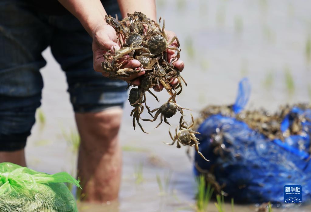 5月31日,河北省唐山市豐南區夏新莊村的農民在稻田內投放螃蟹苗。