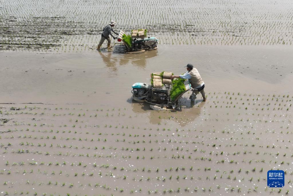 5月31日,河北省唐山市豐南區夏新莊村的農民在田間進行插秧作業(無人機照片)。