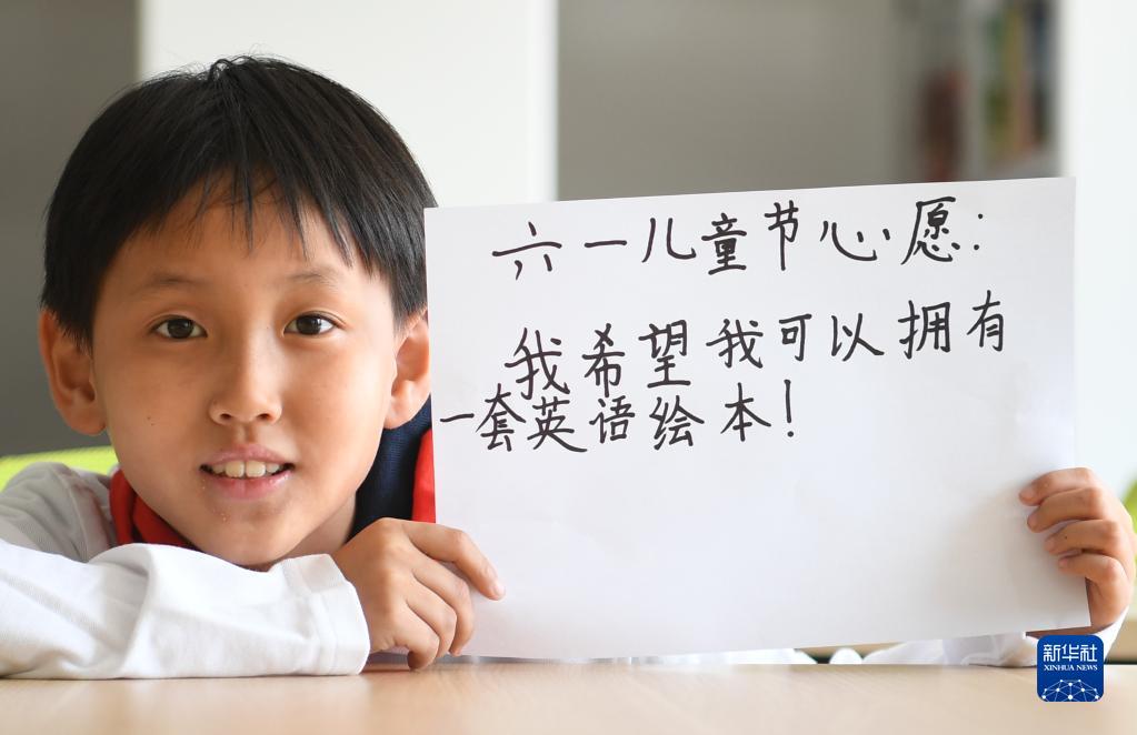 河北雄安新區容東片區容和悅容小學三年級一班孟繁昊展示“六一”微心愿(5月24日攝)。