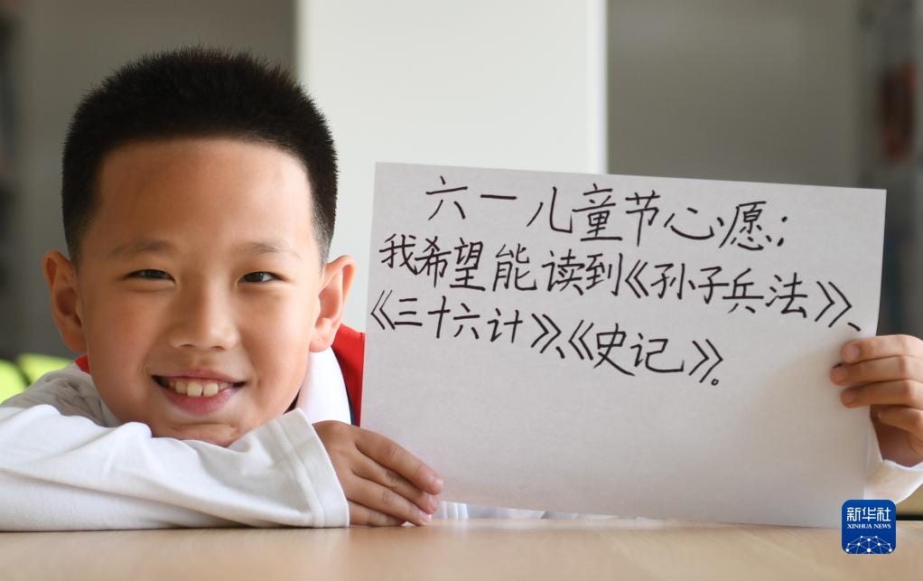 河北雄安新區容東片區容和悅容小學三年級四班王京鵬展示“六一”微心愿(5月24日攝)。