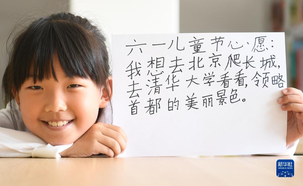 河北雄安新區容東片區容和悅容小學三年級四班段惠馨展示“六一”微心愿(5月24日攝)。