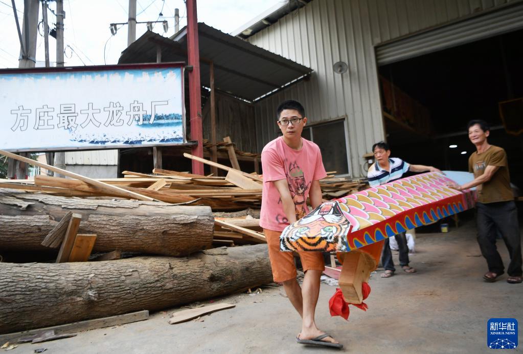 5月31日,在福州市閩侯縣南通鎮方莊村方忠雄龍舟廠,員工將新龍舟運出。