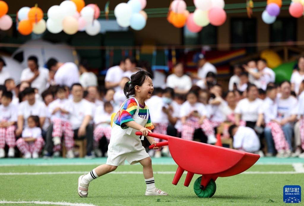 5月31日,在合肥市長江東大街幼兒園舉辦的“萌娃迎六一”活動中,小朋友參加趣味推車游戲。