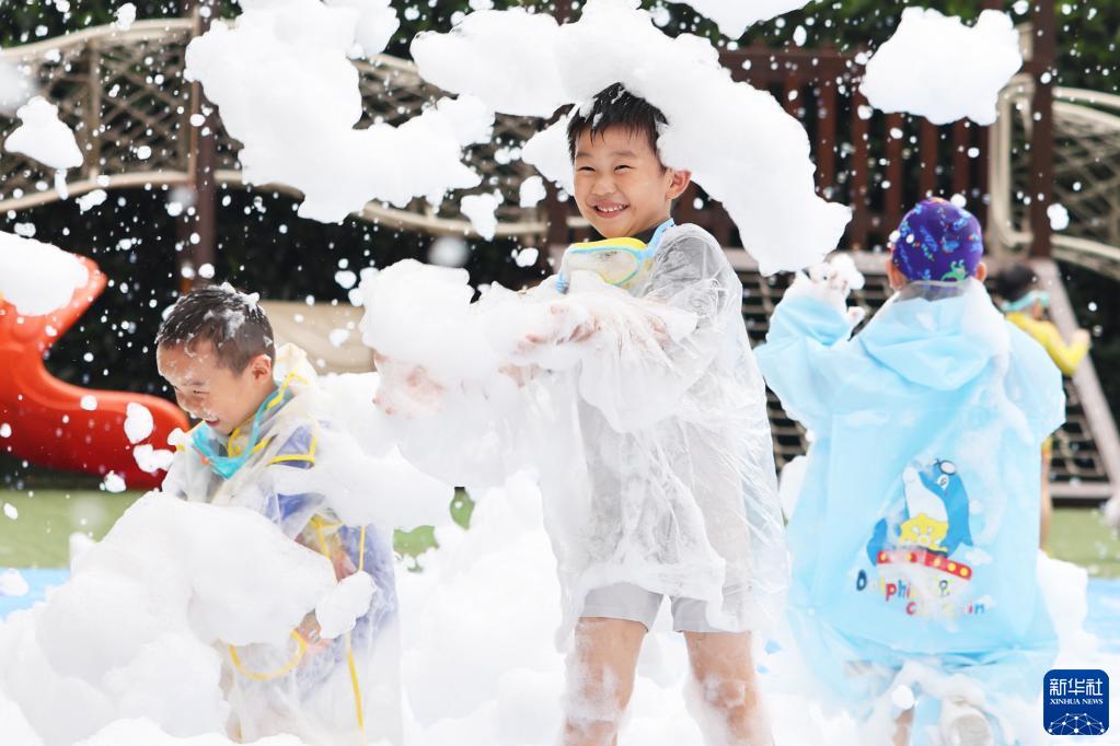 5月31日,在南京市金陵華興實驗幼兒園,小朋友們在“泡泡派對”上玩耍。