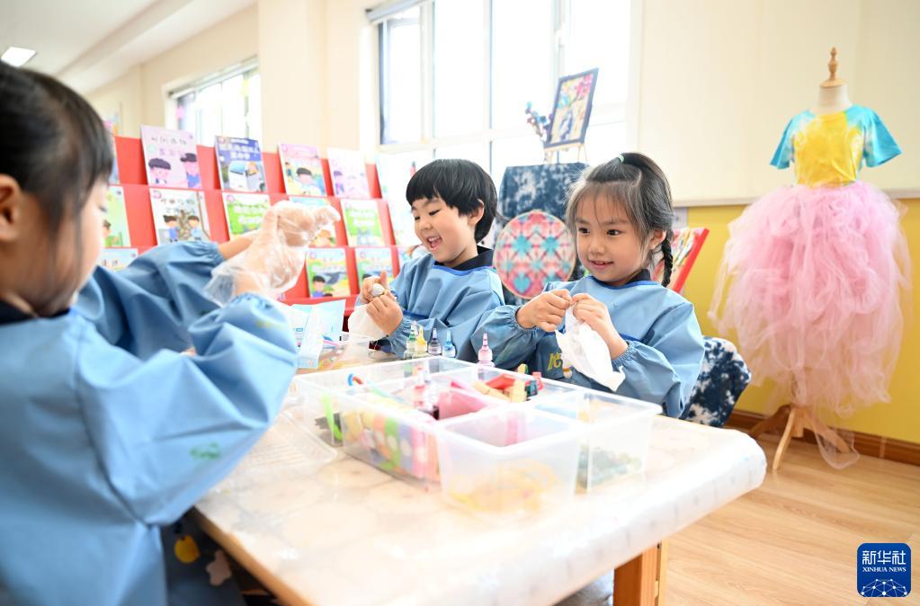5月31日,在天津市和平區第五幼兒園,小朋友學習制作扎染。