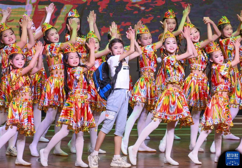 5月31日,新疆烏魯木齊縣中梁小學的學生在文藝演出中表演舞蹈。