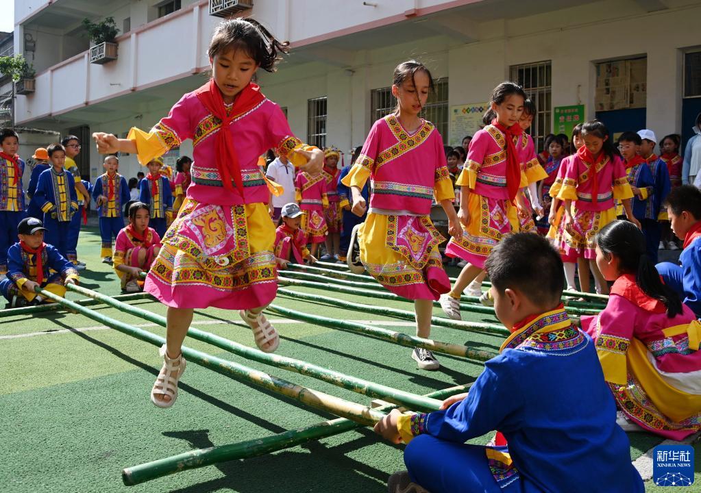 5月30日,在廣西羅城仫佬族自治縣第二小學,學生參加跳竹竿舞比賽。