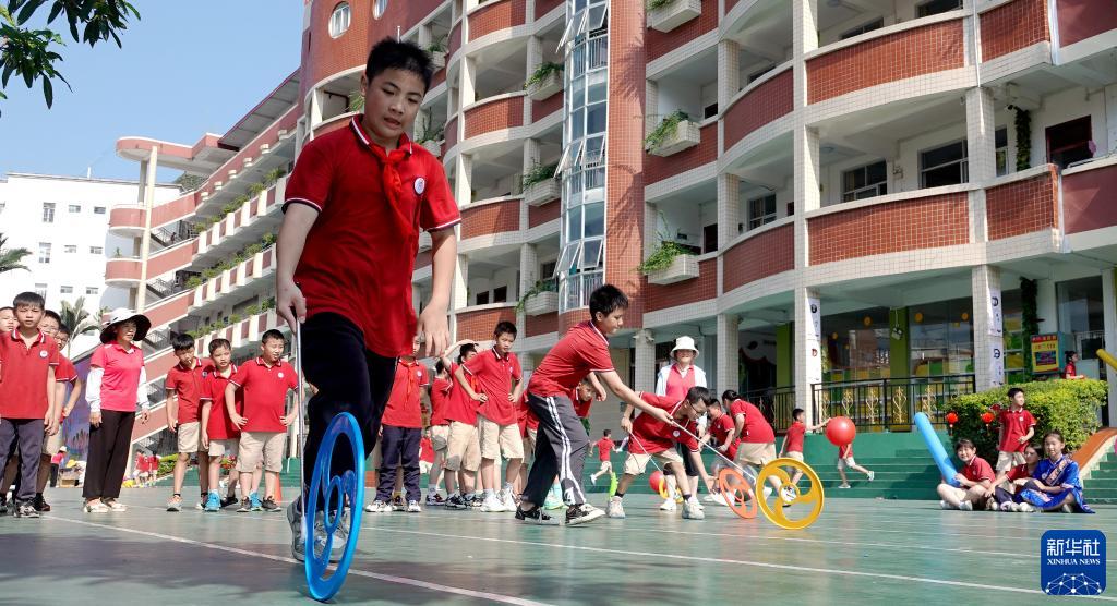 5月31日,廣西河池市金城江區第四小學學生在校園參加“滾鐵環”趣味游戲。