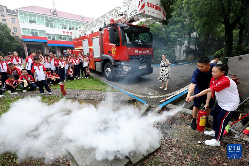 5月31日,在湖南省資興市消防救援大隊舉辦的開放日活動上,小朋友在消防員指導下學習使用滅火器。