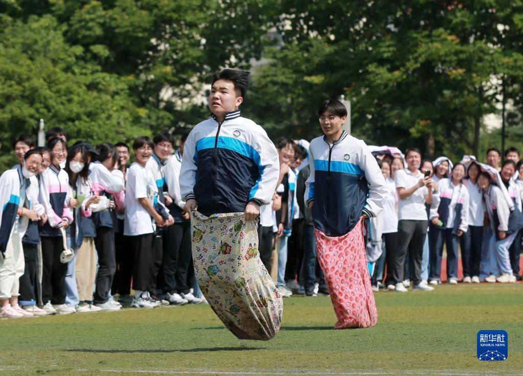 5月31日,在淮北市第十二中學,高三學生在參加“袋鼠跳”趣味減壓游戲。