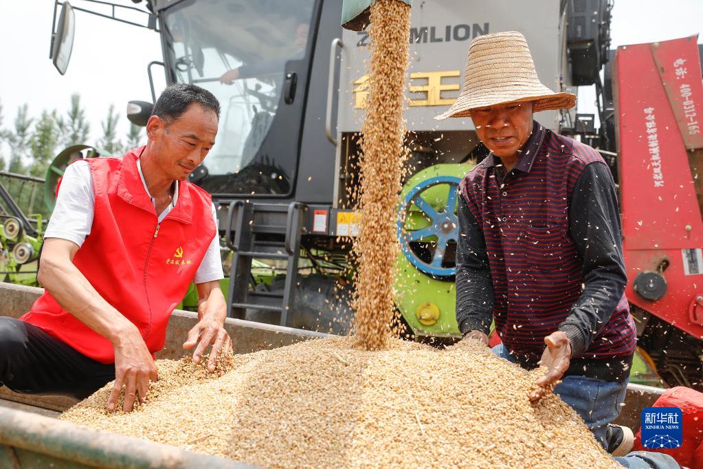 5月31日,河南省開封市尉氏縣南曹鄉的黨員志愿者在幫助農戶搶收小麥。