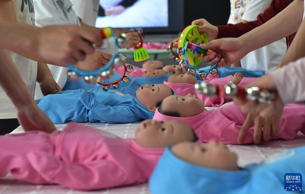 5月31日,在沈陽工學院嬰兒照顧實訓室,學前教育學院的同學進行嬰兒照顧培訓。