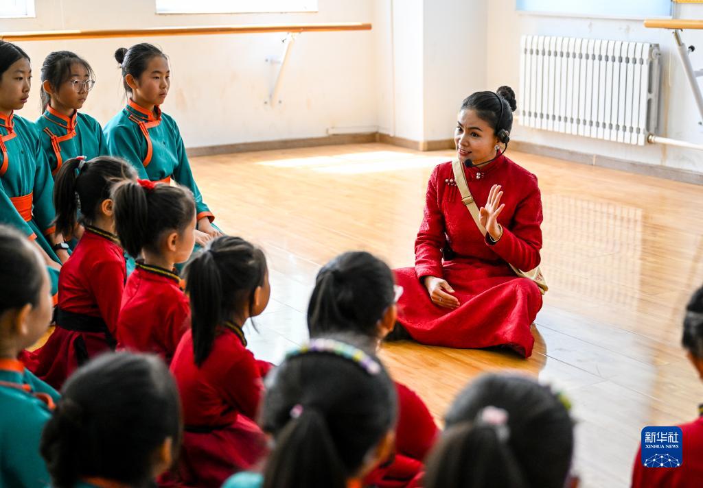 5月31日,蘇尼特右旗烏蘭牧騎隊員為“小小烏蘭牧騎”隊員講述烏蘭牧騎的故事。