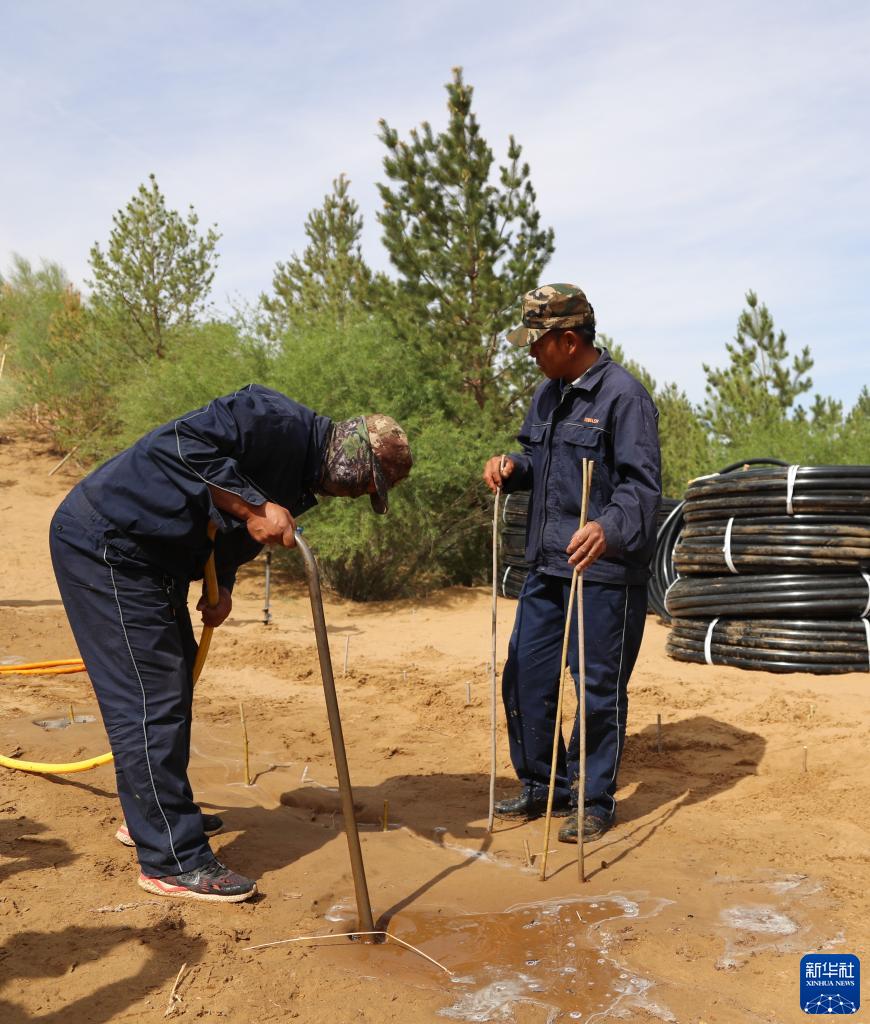 5月31日,治沙工人在庫布其沙漠億利生態治理區用微創氣流植樹法種植樹木。