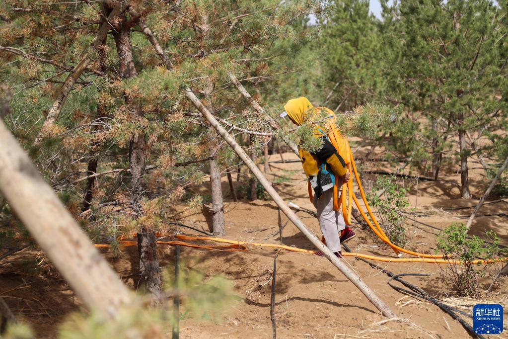 5月31日,治沙工人在庫布其沙漠億利生態治理區內搬運水管,準備為樹木澆水。