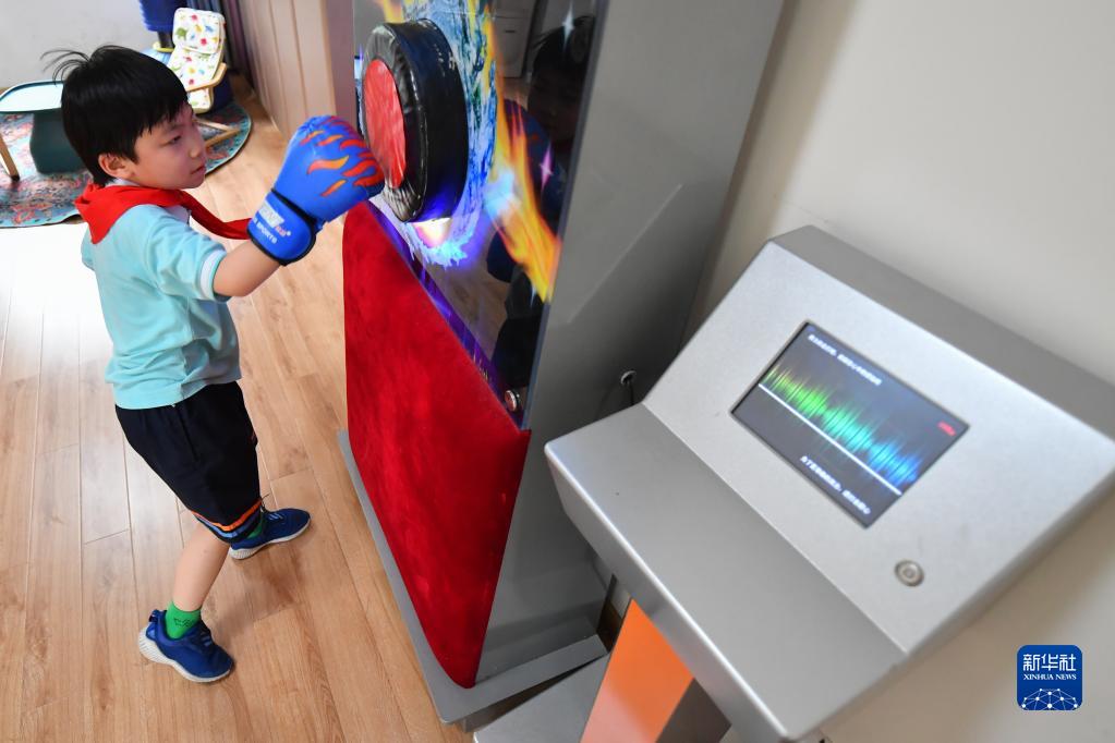 5月31日,在長沙市岳麓區實驗小學“心語花溪”心理成長中心的情緒宣泄室,學生通過打拳擊放松心情。