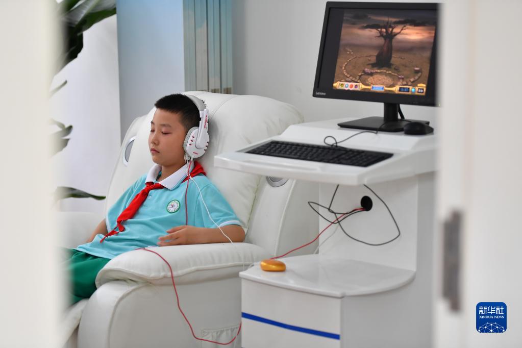 5月31日,在長沙市岳麓區實驗小學“心語花溪”心理成長中心的音樂放松室,學生在聽音樂放松身心。
