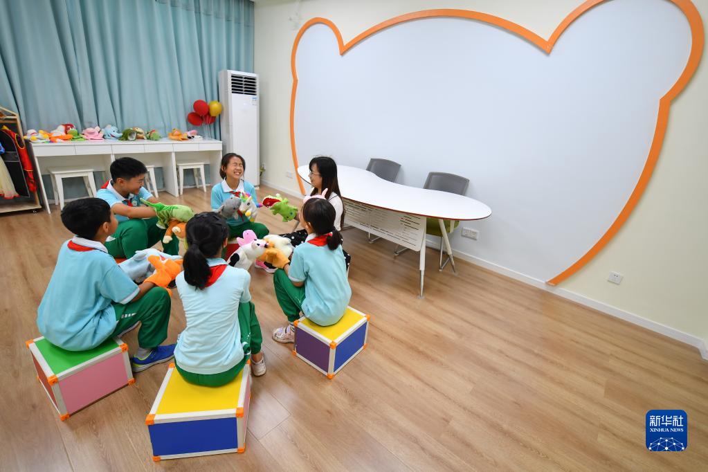 5月31日,在長沙市岳麓區實驗小學“心語花溪”心理成長中心,學生在心理健康輔導老師的帶領下通過心理劇場的方式表達內心的想法。