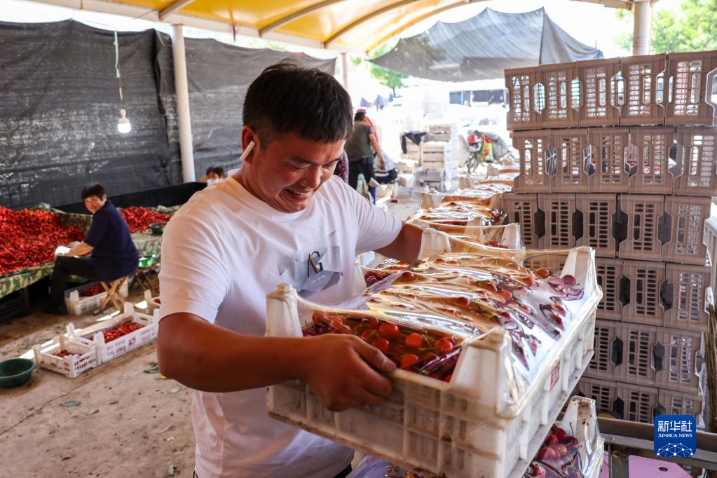 5月31日,來自安徽的客商卜九峰在燕崖鎮櫻桃交易市場內搬運櫻桃。