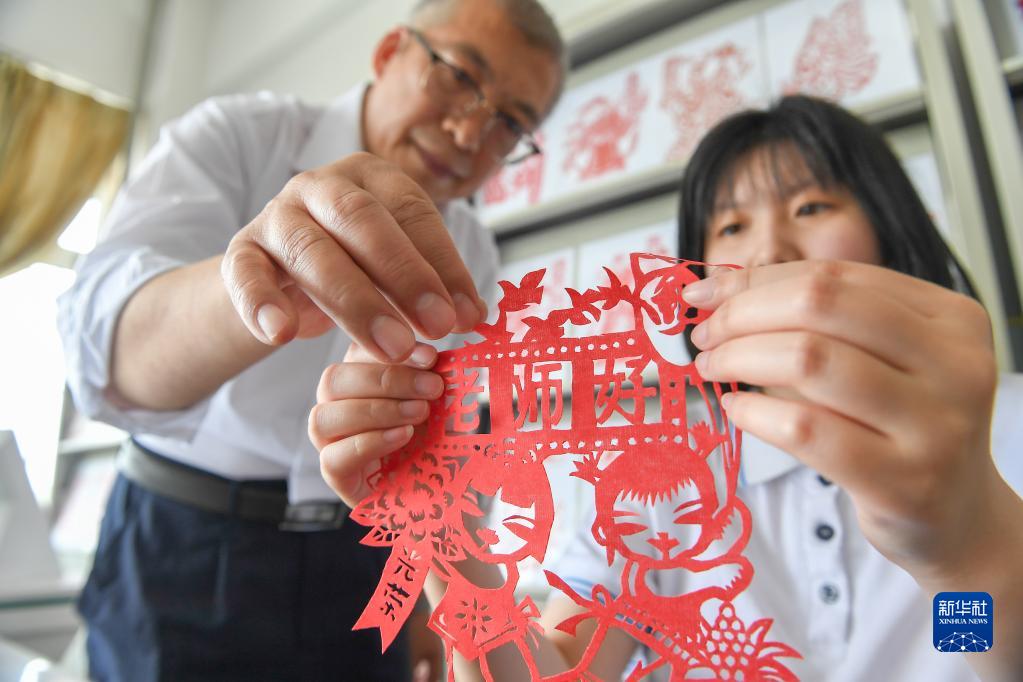 5月31日,在四平市聾啞學校,教師霍明燚(左)與殘障學生展示紙刻作品。