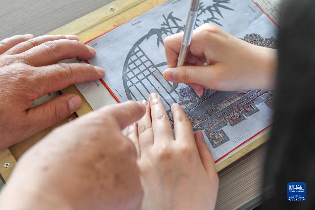 5月31日,在四平市聾啞學校,教師霍明燚教授殘障學生紙刻技藝。