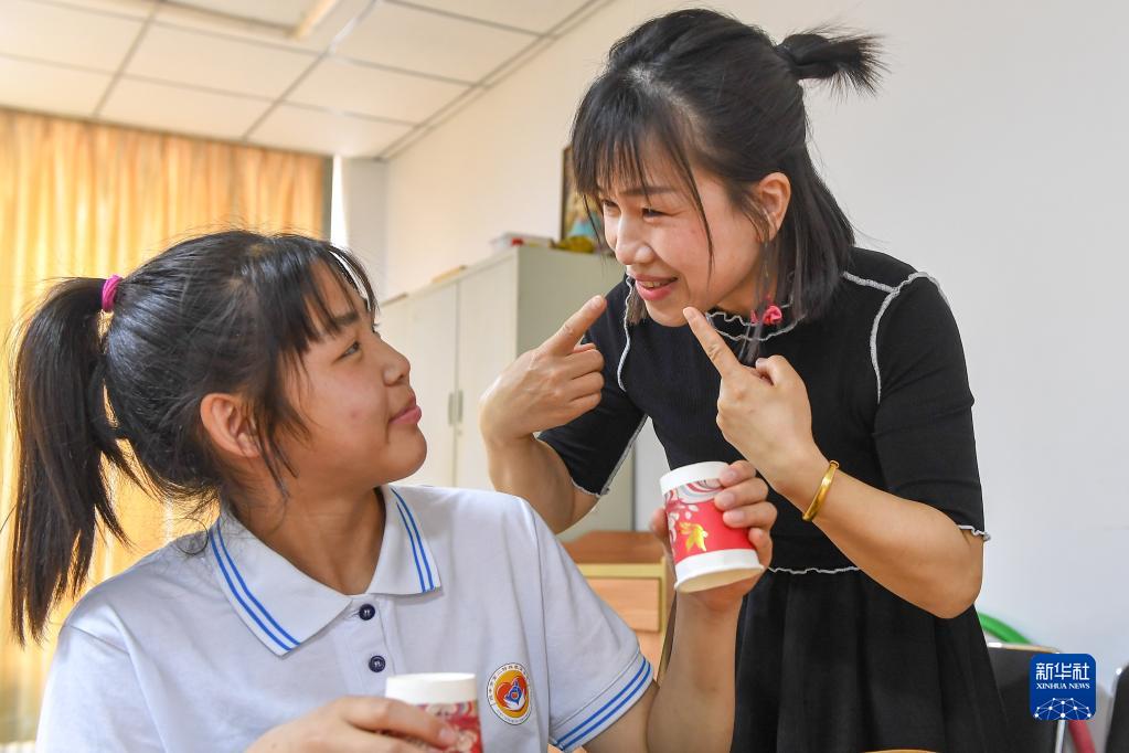 5月31日,在四平市聾啞學校,教師李洪敏(右)為殘障學生上律動課。