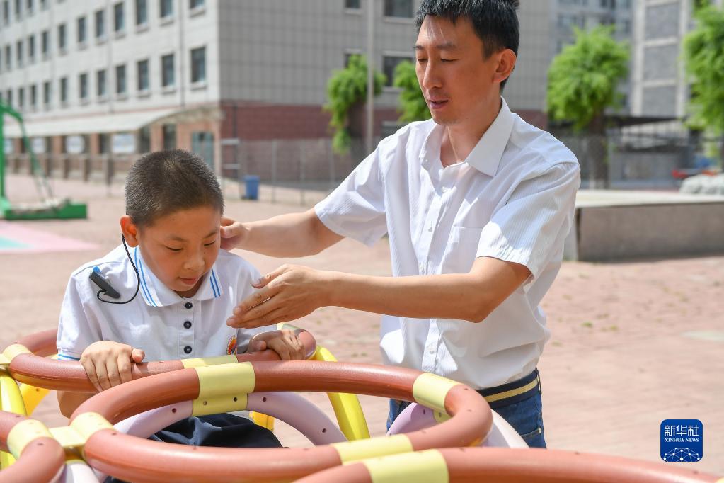 5月31日,在四平市聾啞學校,教師李瑞楠(右)陪伴殘障學生進行課間游戲。