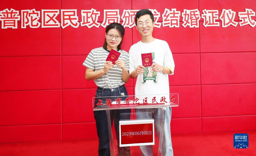 6月1日,來自江蘇的劉先生和袁女士在上海市普陀區婚姻收養登記中心展示他們剛領取的結婚證。