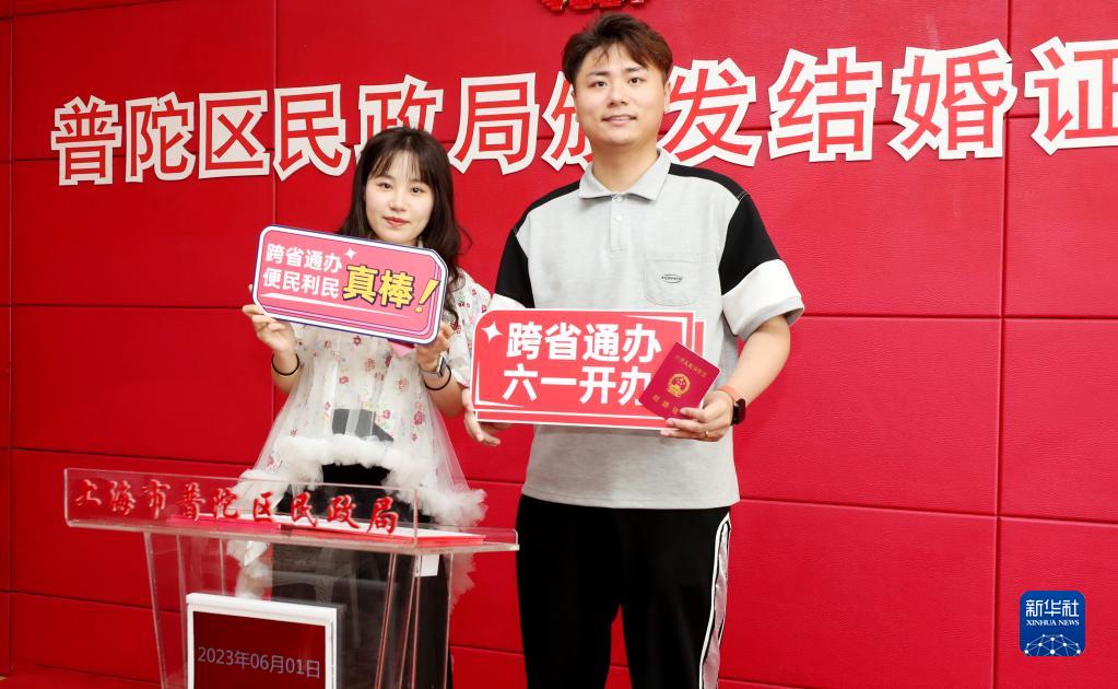 6月1日,來自陜西的劉先生和姚女士在上海市普陀區婚姻收養登記中心完成婚姻登記“跨省通辦”。