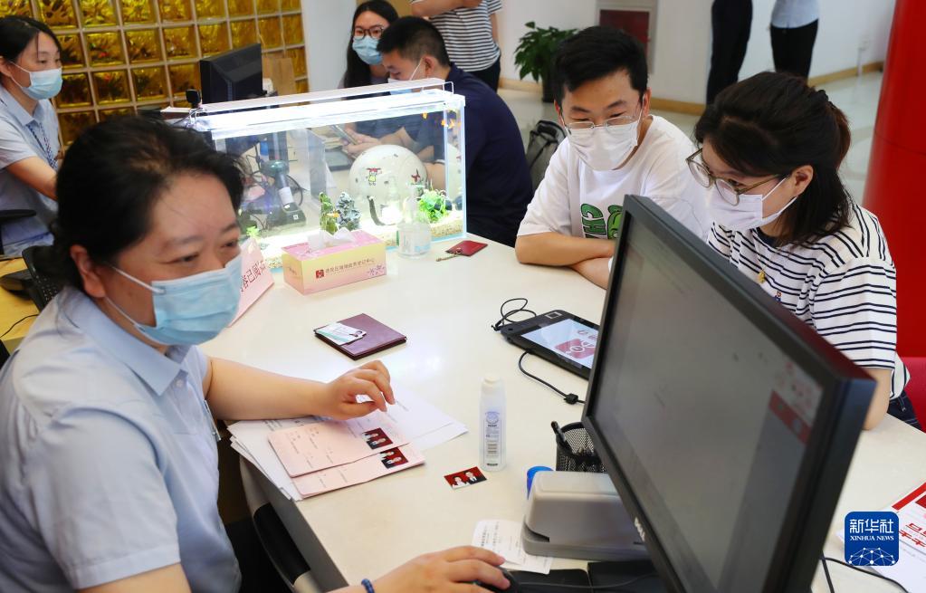 6月1日,來自江蘇的劉先生(右二)和袁女士(右)在上海市普陀區婚姻收養登記中心辦證柜臺上遞交結婚登記相關材料。