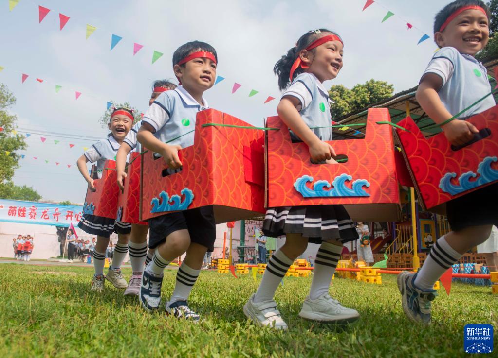 6月1日,在湖南省永州市道縣教育局示范幼兒園,孩子們參加“龍舟賽”。