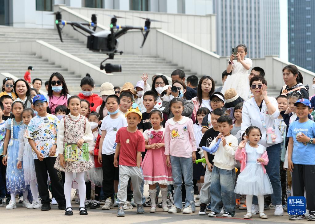 6月1日,在烏魯木齊市公安局交警支隊警營開放日活動上,孩子們在觀看無人機設備展示。