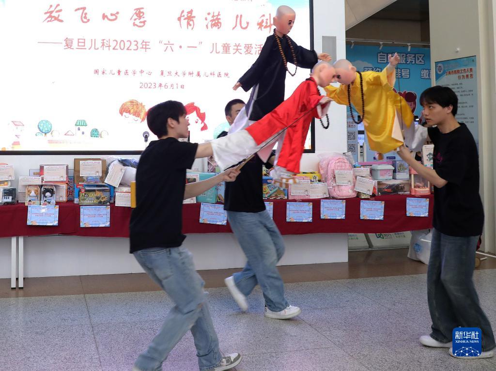 6月1日,在復旦大學附屬兒科醫院的門診大廳,上海戲劇學院木偶專業的大學生志愿者在表演木偶劇。