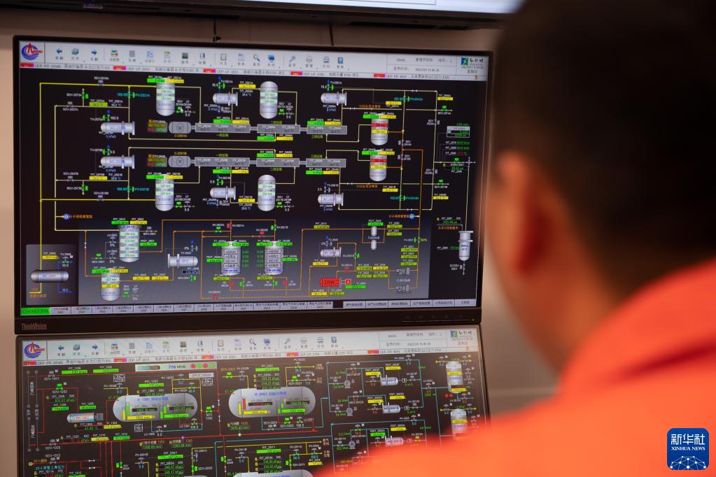 6月1日,在中國海油恩平15-1原油鉆采平臺上的中控室,工作人員查看二氧化碳注入系統中控畫面。