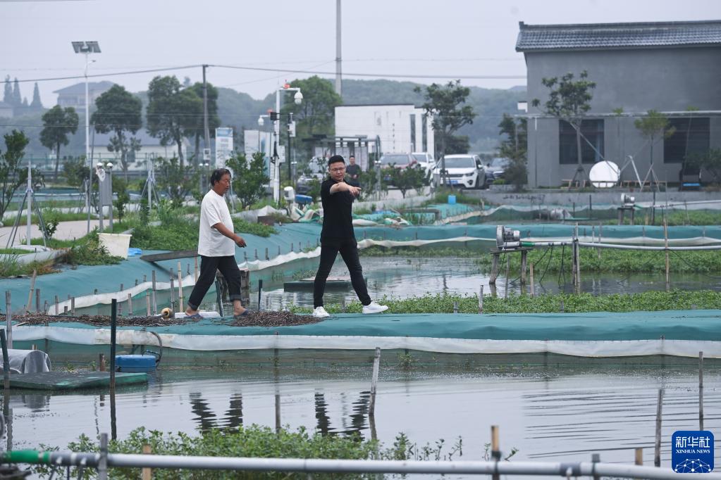 6月1日,欒金祥(右)在浙江省湖州市織里鎮湖星農業科技有限公司的湖蟹養殖基地內查看湖蟹的生長情況。欒金祥是美國紐約州立大學碩士畢業,回國后在家鄉投身現代農業管理,帶動蟹農創收,2022年公司湖蟹養殖銷售額達5000萬元人民幣。