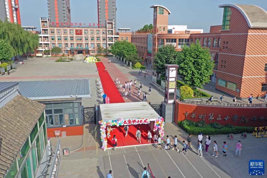 中關村第三小學雄安校區的學生走入校園(6月1日攝,無人機照片)