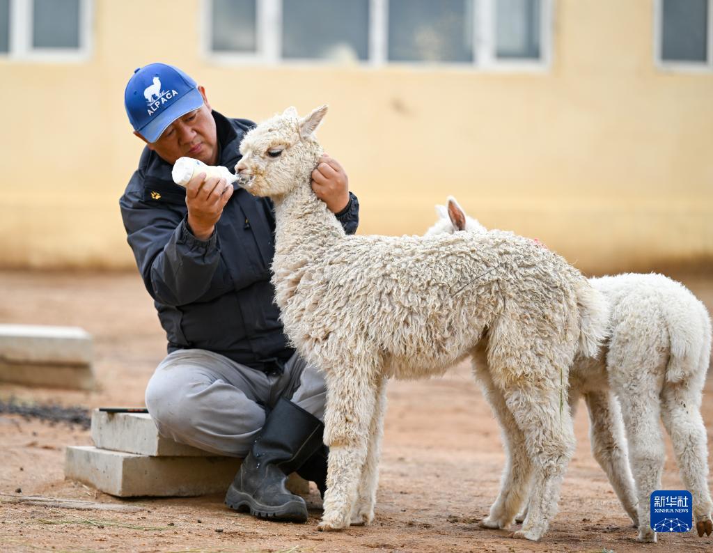6月1日,巴彥杭蓋嘎查羊駝養殖基地的工作人員給小羊駝喂奶。