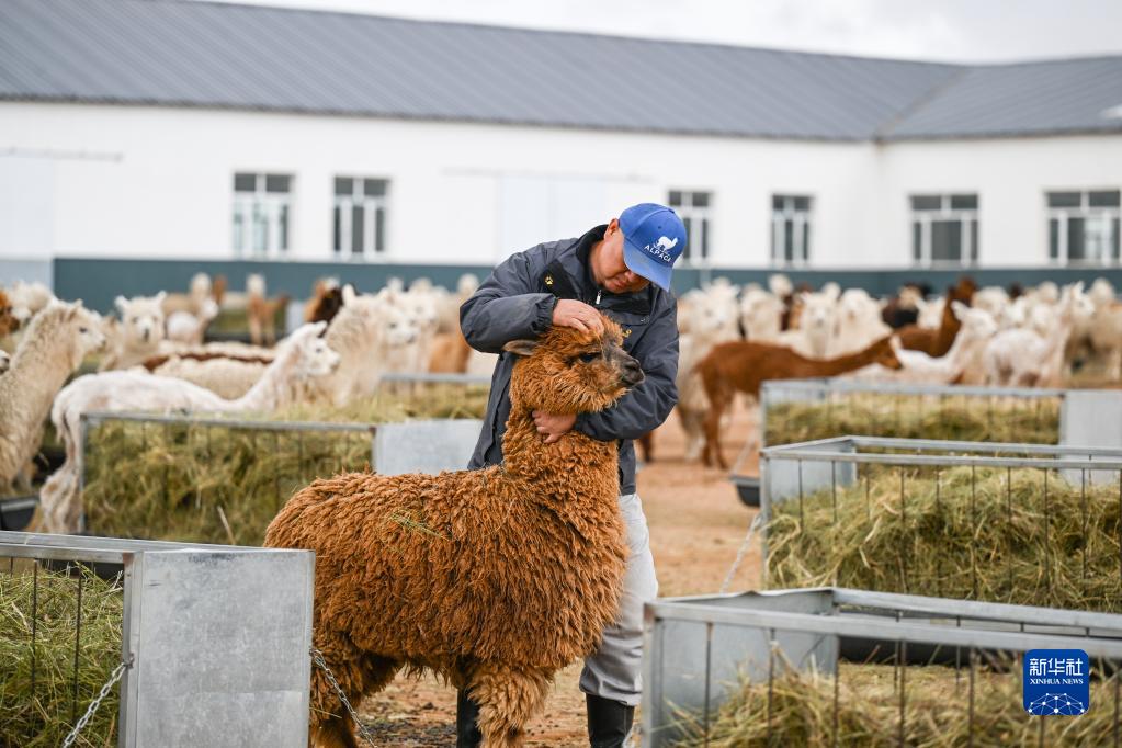 6月1日,巴彥杭蓋嘎查羊駝養殖基地的工作人員在觀察羊駝的飼養情況。