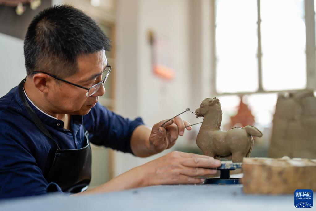 6月1日,泥塑藝人在河北省玉田縣亮甲店鎮的一家泥塑工作室內修整泥胚。