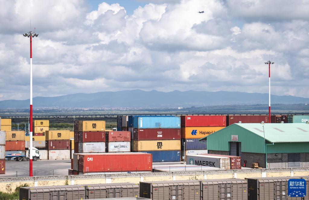 這是5月23日在肯尼亞內羅畢拍攝的蒙內鐵路肯尼亞站區附近待運輸的集裝箱。