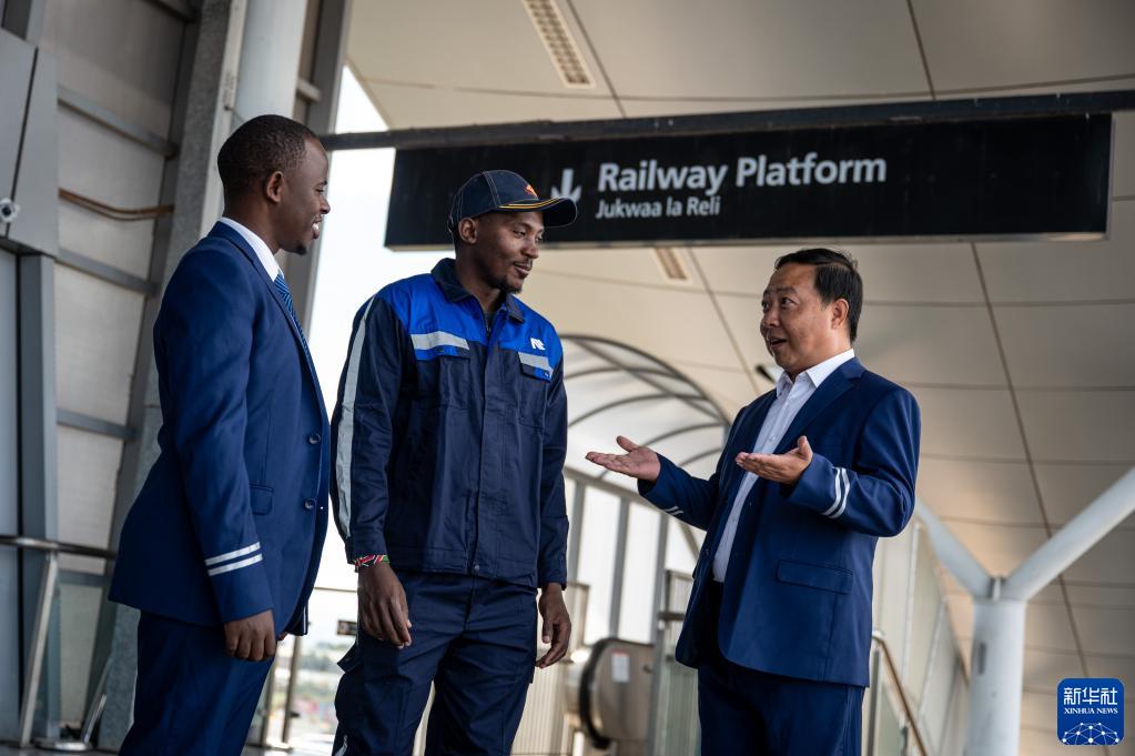 5月23日,在肯尼亞內羅畢,毛鑫(右)與同事在內羅畢站內交流。
