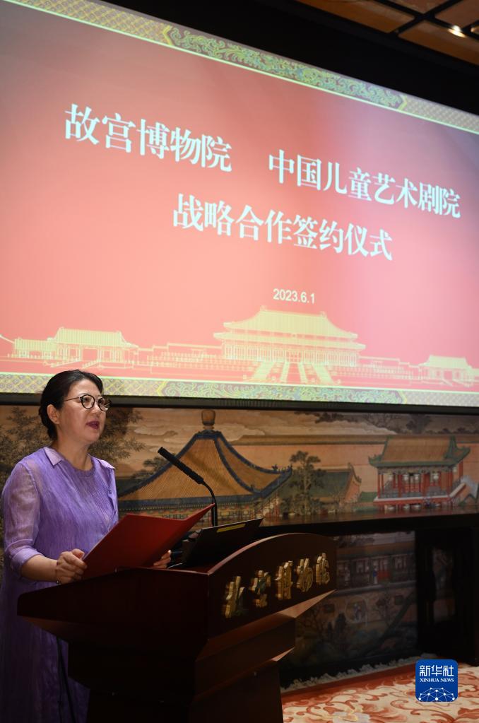 當日,故宮博物院與中國兒童藝術劇院在北京舉行戰略合作簽約儀式。雙方將在劇目創排、打造品牌、文創產品開發等方面加強合作,攜手打造以故宮為題材的兒童戲劇精品,利用舞臺藝術形式,讓中華優秀傳統文化走進中國孩子的心里,也讓更多少年兒童走進故宮博物院,走進中國兒童劇場。