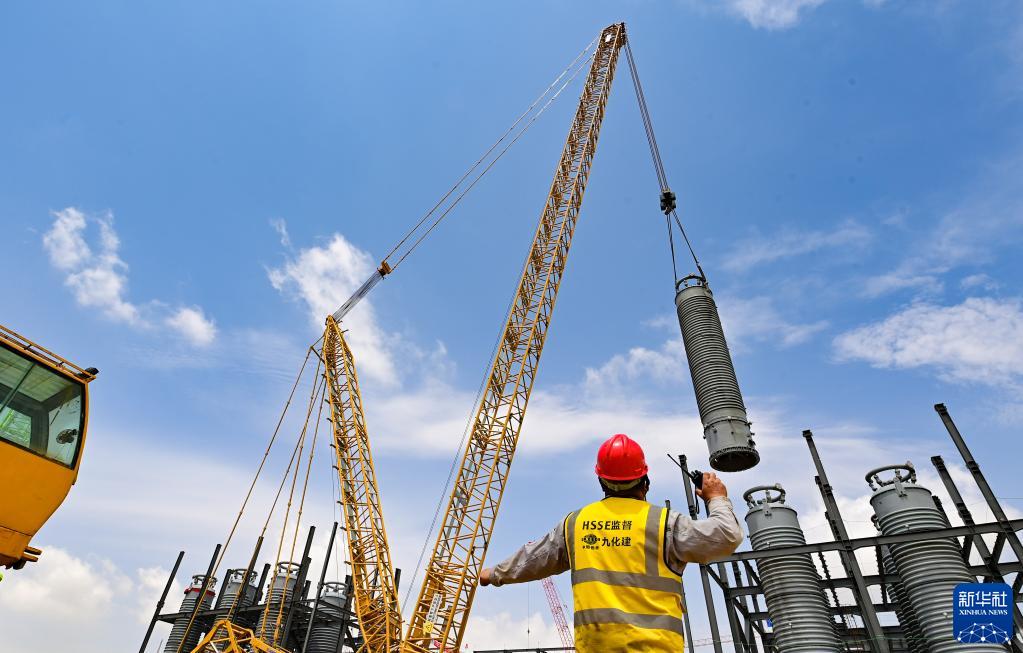 6月1日,工人在鄂托克前旗光伏裝備制造全產業鏈科技示范項目施工現場安裝設備。
