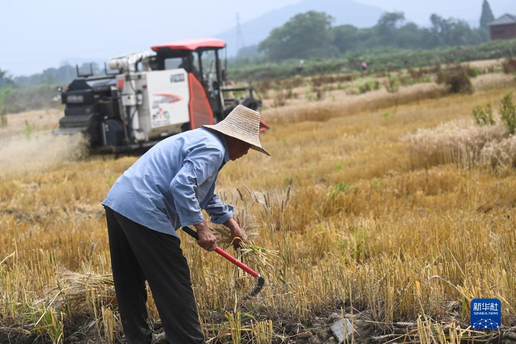 6月1日,在道場鄉施家橋村的麥田里,種植戶在手工收割邊角的小麥。