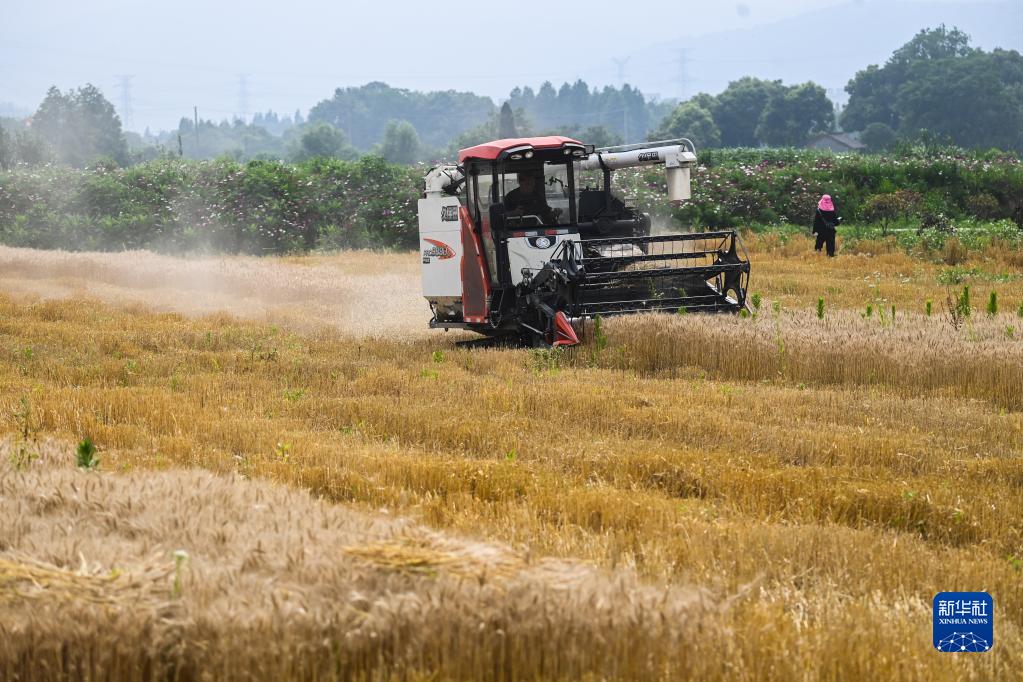 6月1日,在道場鄉施家橋村的麥田里,收割機在搶收小麥。