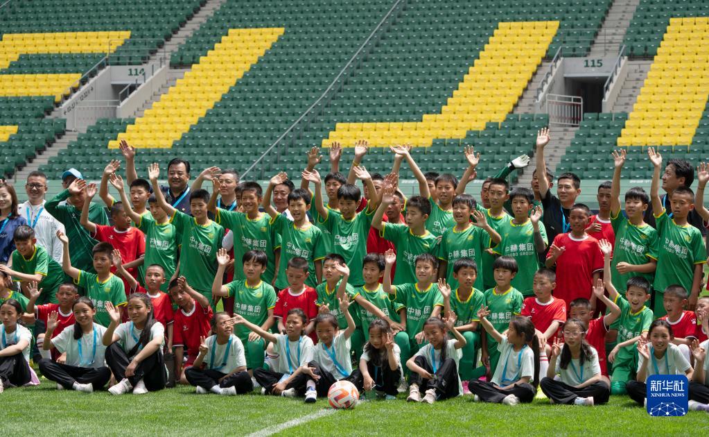 6月1日,在北京工人體育場,藏族孩子與國安少年足球隊隊員和工作人員合影留念。